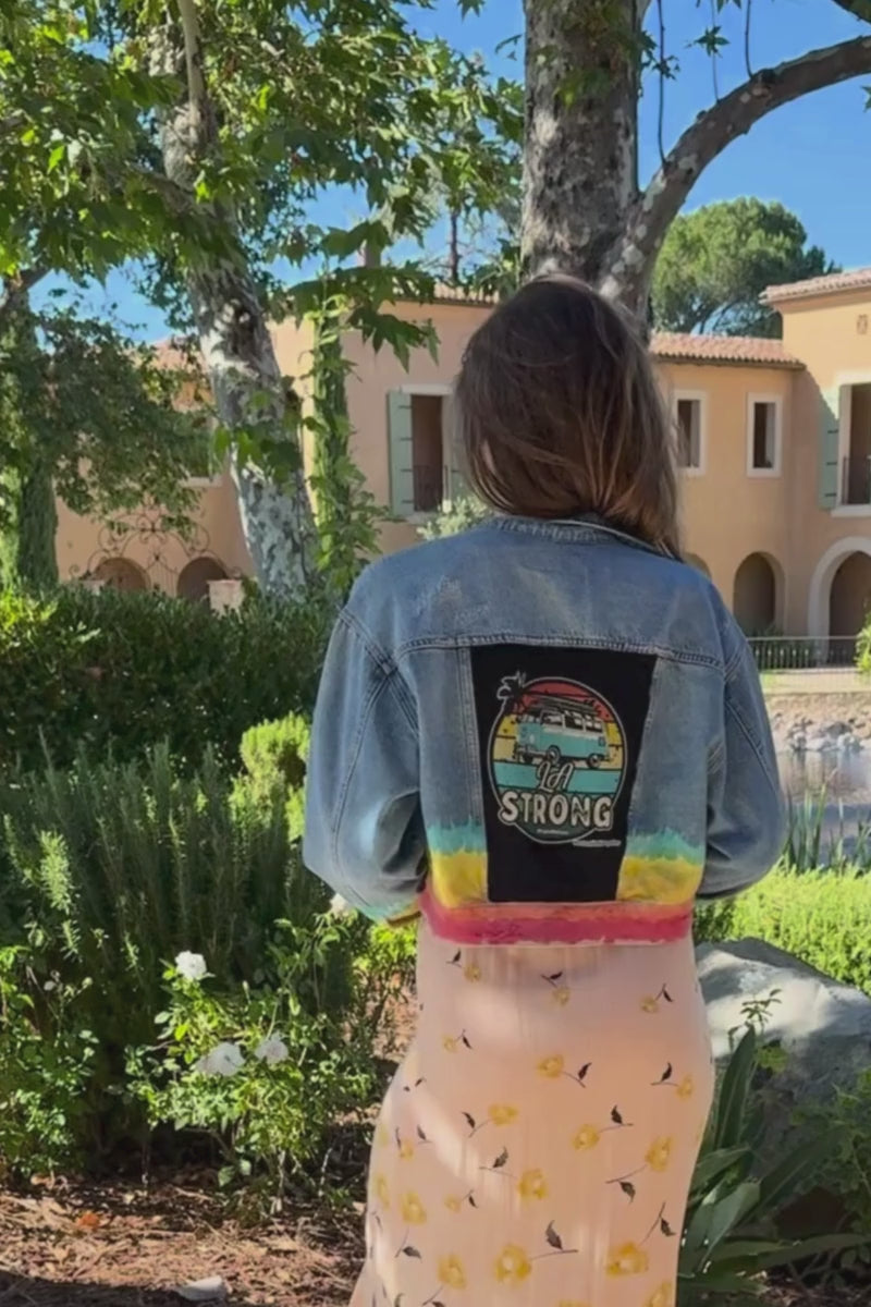 Description: This Blank NYC denim jacket blends eco-conscious fashion with local pride. Featuring slight distressing on the collar and back, bold red, orange, yellow, and aqua detailing, and a striking black LA Strong T-shirt applique on the back, it’s a wearable statement of style and solidarity.